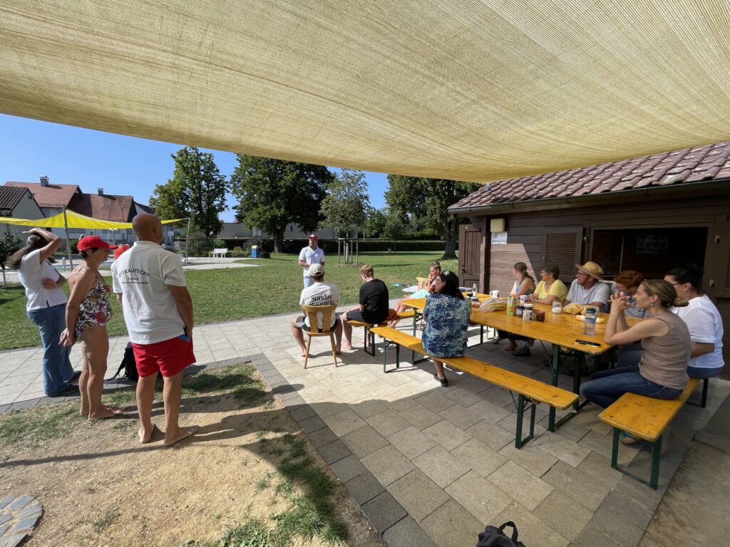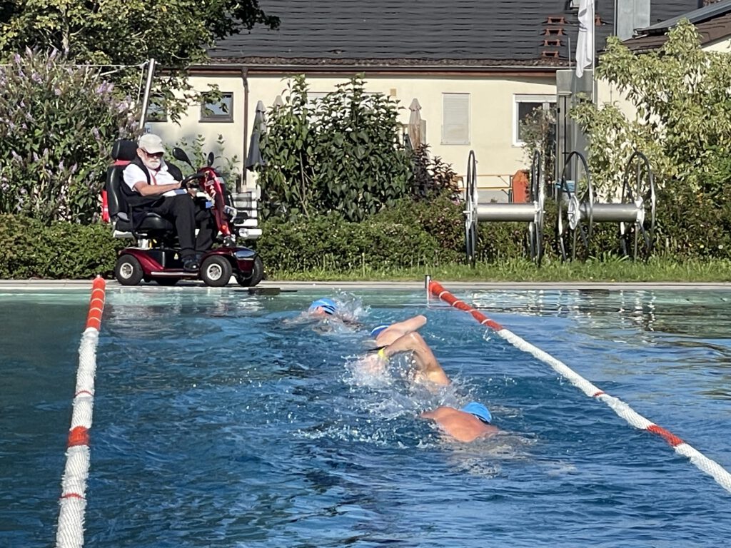 Unter der strengen Aufsicht von Georg – es sind ja keine Schwimmpausen, ein Festhalten am Beckenrand oder ähnliches erlaubt – wurden dann die Bahnen gezogen. Dabei gruppierten sich die Kameraden nach Tempo von eher gemütlich bis sportlich ambitioniert (hier etwa unser „4er-Express“ mit seinen am Ende 5,6 km in 2 h) auf die verschiedenen Bahnen des Beckens.